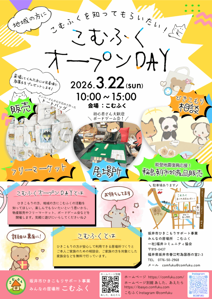 3/22(日)こむふくオープンDAYを開催します! 3/22(日曜日)10時~15時、こむふくで地域の方に向けたイベントを開催します。 【販売】メンバーさんのイラストで作ったトートバック販売、能登地震復興応援輪島物産販売、フリーマーケット 【居場所体験】ボードゲームで遊ぼう 【ひきこもり相談】こむふく相談員と話してみませんか?事前連絡不要、お気軽にお越しください! みなさまのお越しをお待ちしております!
