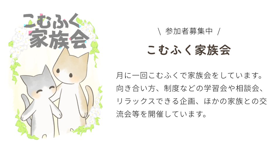 家族茶話会、学習会、リラックスできるような企画を月1回こむふくで開催しています。
